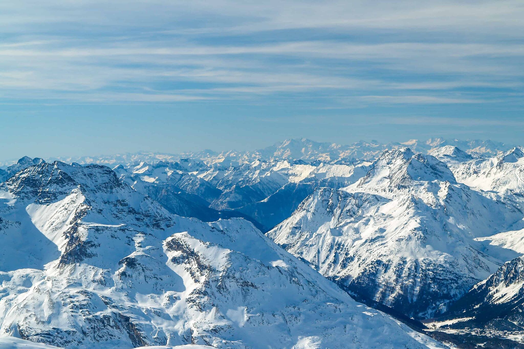 The best mountains for iconic views of the famous Swiss winter Alps are Mittelallalin, Jungfraujoch, Gornergrat, Eggishorn, Bettmerhorn and Männlichen.