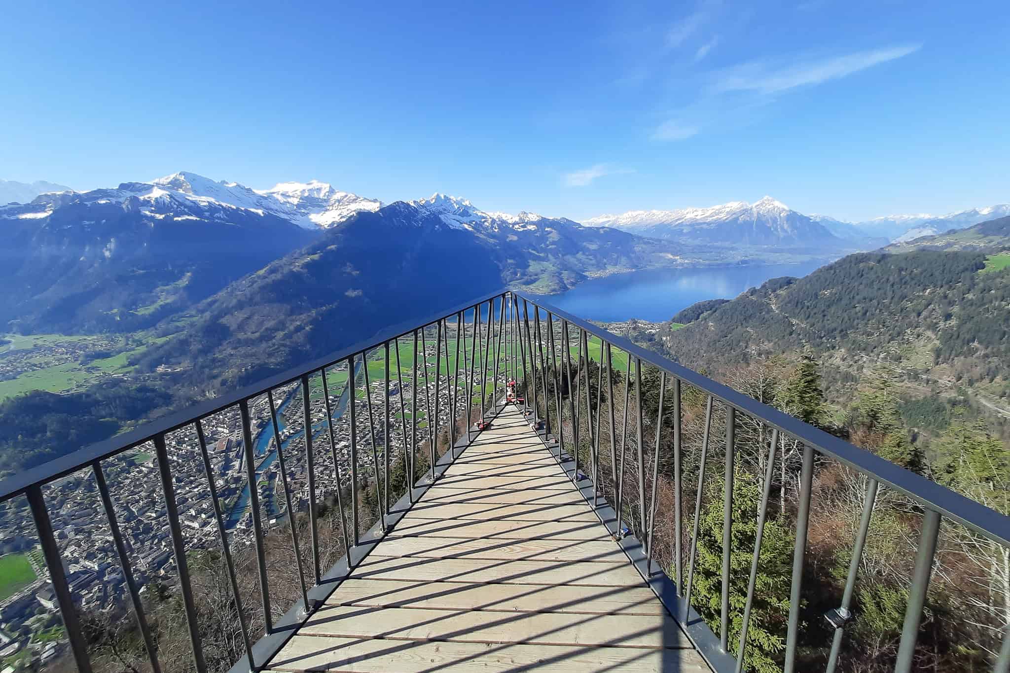 - Admire the views from a spectacular viewing platform, supported by a steel construction. It’s called the ‘Two Lakes Bridge’, as you can look down onto Lake Thun and Lake Brienz. You’ll also see the famous mountain trio Eiger, Mönch and Jungfrau, framed by the rest of the Jungfrau Region and other parts of the Bernese Oberland.