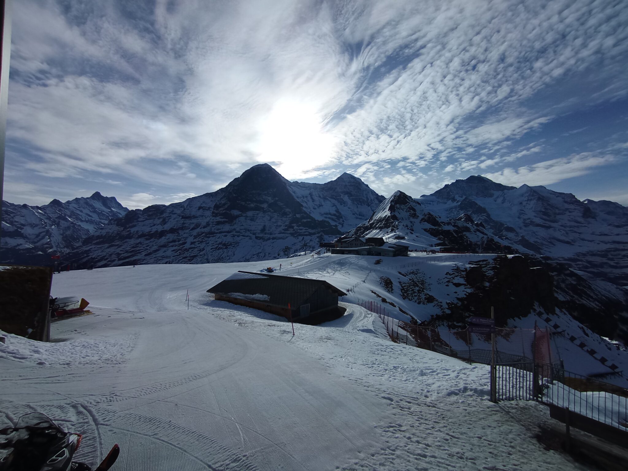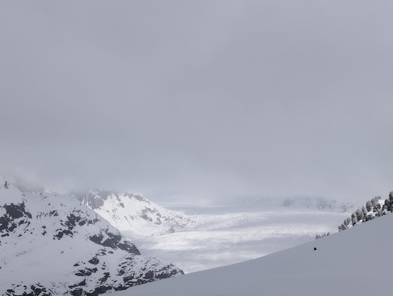 We had light snowfall on the day of this hike. The clouds partially obstructed the views over the Aletsch glacier, but on the other hand, it was a magical experience to watch the sun and clouds play hide and seek with us walking in the freshly falling snow. The entire way is downward sloping with viewing points at Hohfluh & Riderfurka giving sweeping views over the Aletsch glacier. The sign posted time was 2hours 30 min for this hike, but we took a leisurely 3 hours 30 mins enjoying the beautiful weather.