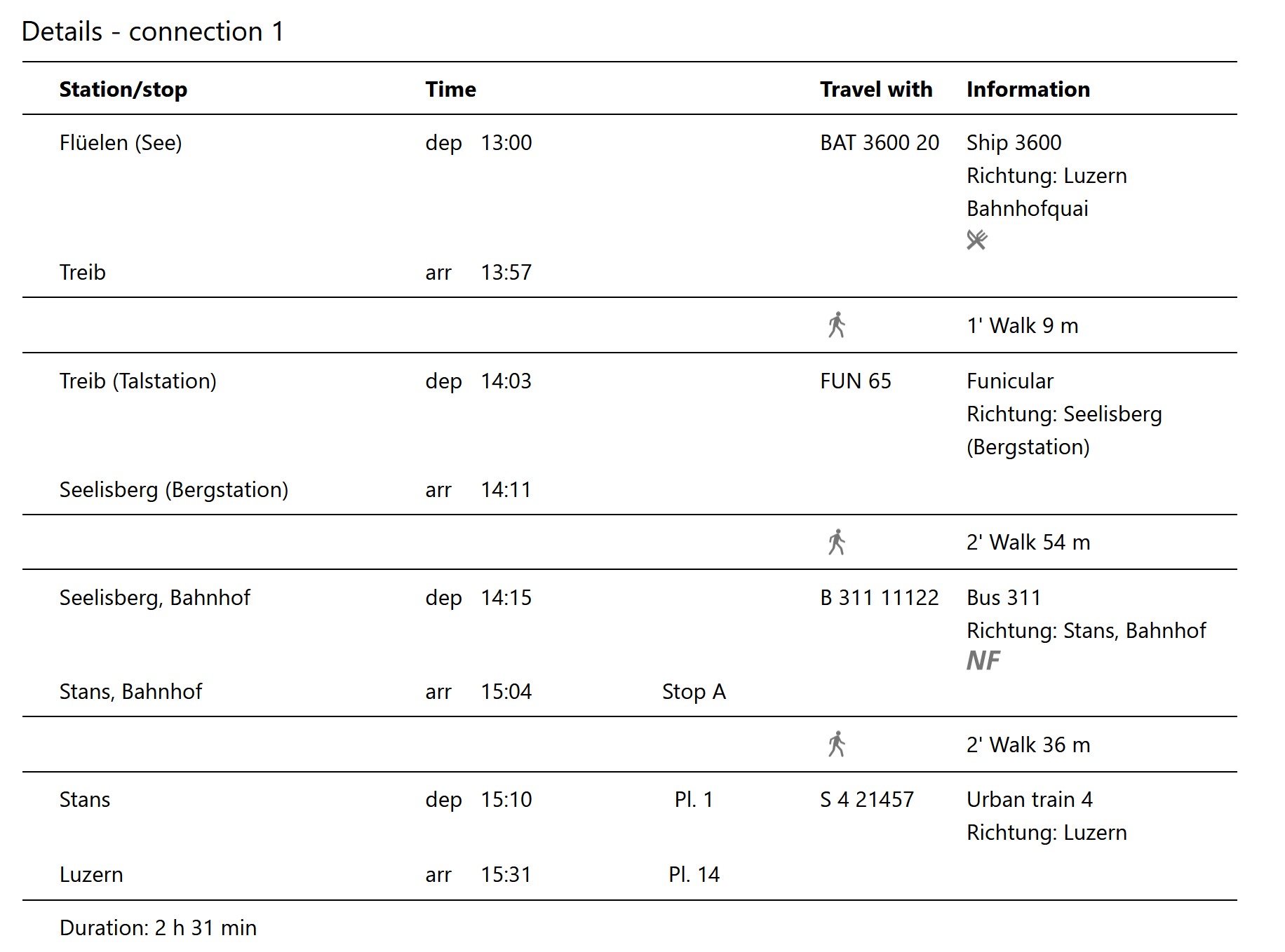 - On arrival at Flüelen at 12:55, stay on the boat. It will leave again (headed back to Luzern) at 13:00.
