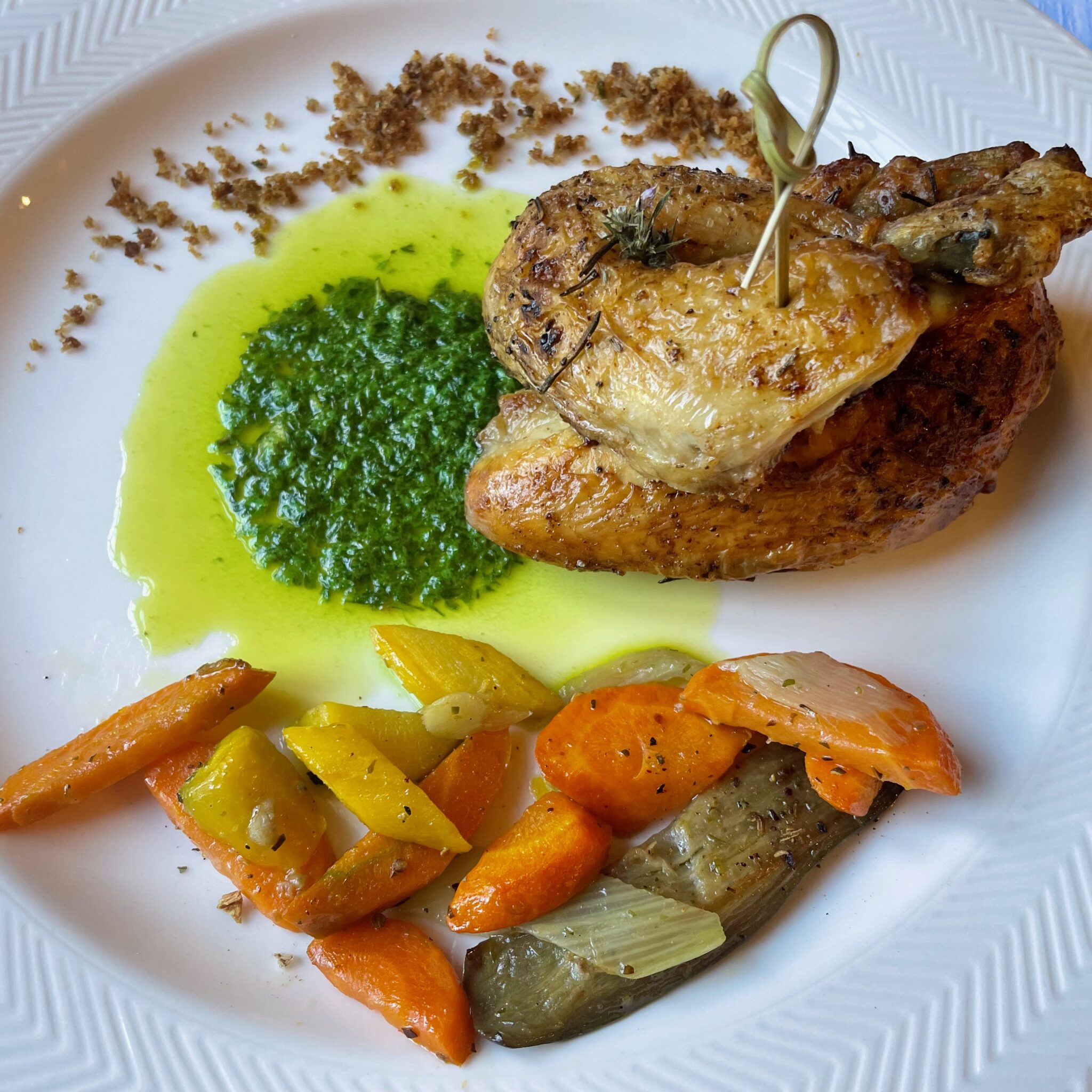 The food is classic French Swiss and we start by sharing a good house-made terrine served with a generous salad garnished with pepitas. Next that spit-roasted chicken with very good rösti and, because I can’t resist fruit tarts, Franz has a slice of the plum and I try the apple. Both are rich, heavy and tasty.
