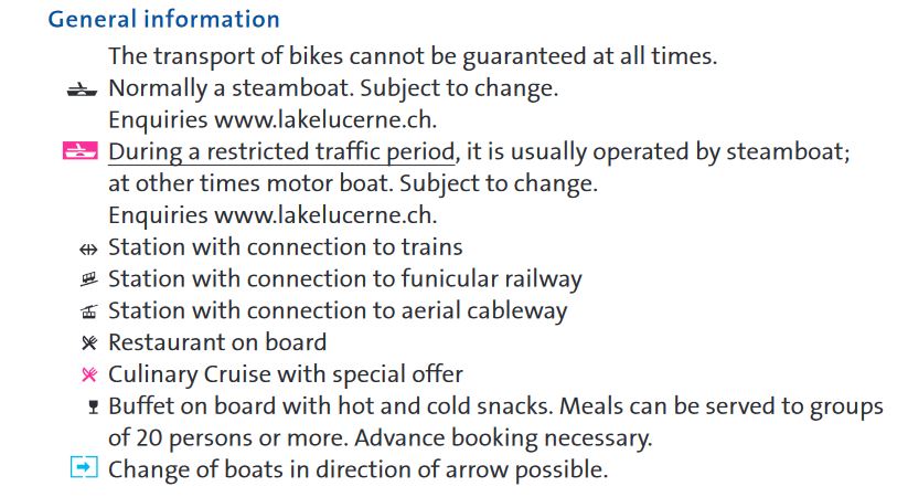 For the boats on Lake Lucerne, there are symbols and numbers to explain the details (see screenshots). Notes at the foot of the timetable explain the symbols.