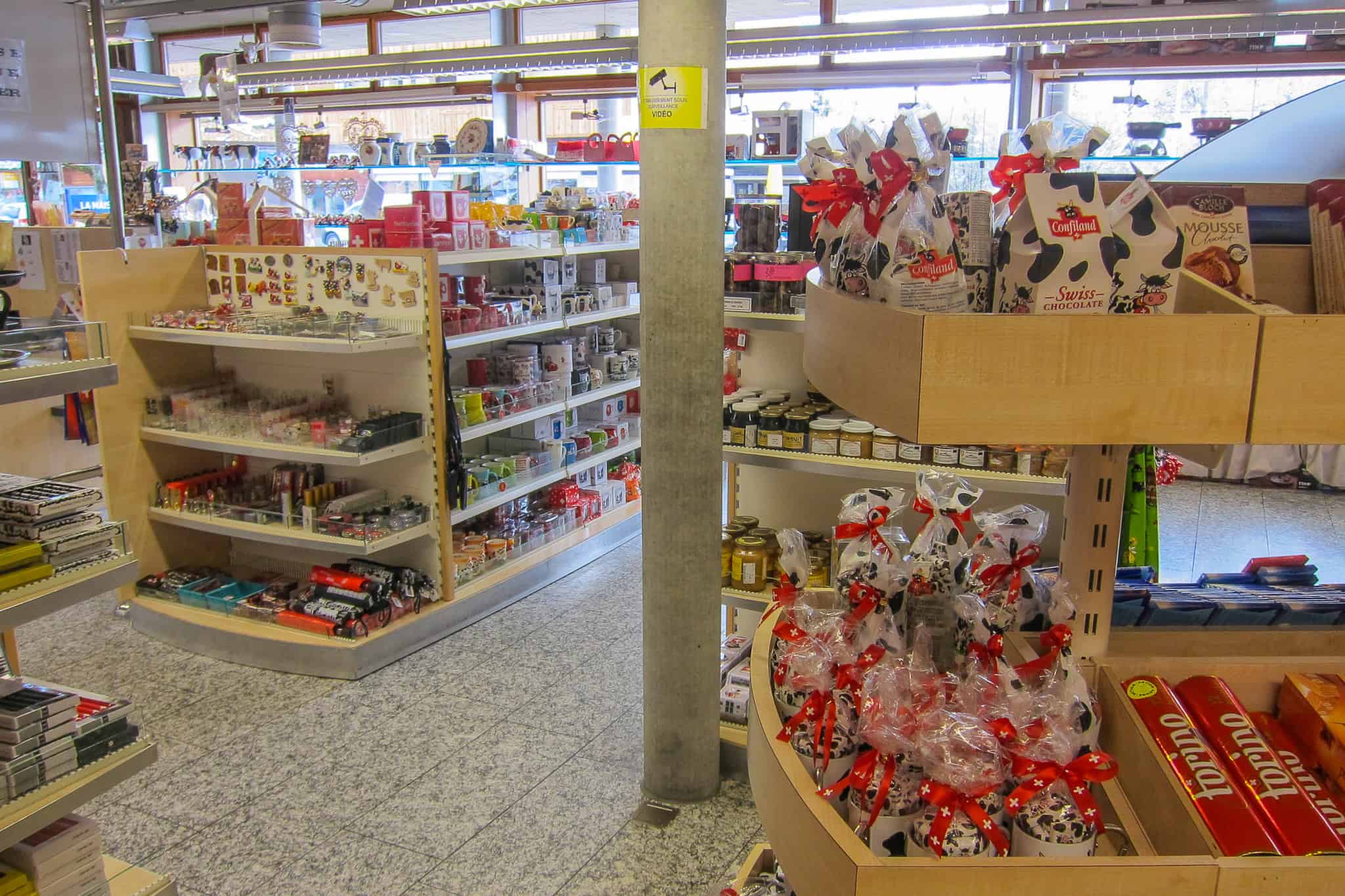 Im Geschäft können Sie auch Käse, Fondue, Rahm, Butter, Süßigkeiten und andere lokale und Schweizer Produkte kaufen. Viele Käseprodukte im Geschäft sind vakuumversiegelt, sodass Sie sie eine Zeit lang außerhalb des Kühlschranks aufbewahren können. Auch andere Produkte, die lang haltbar sind, werden verkauft.