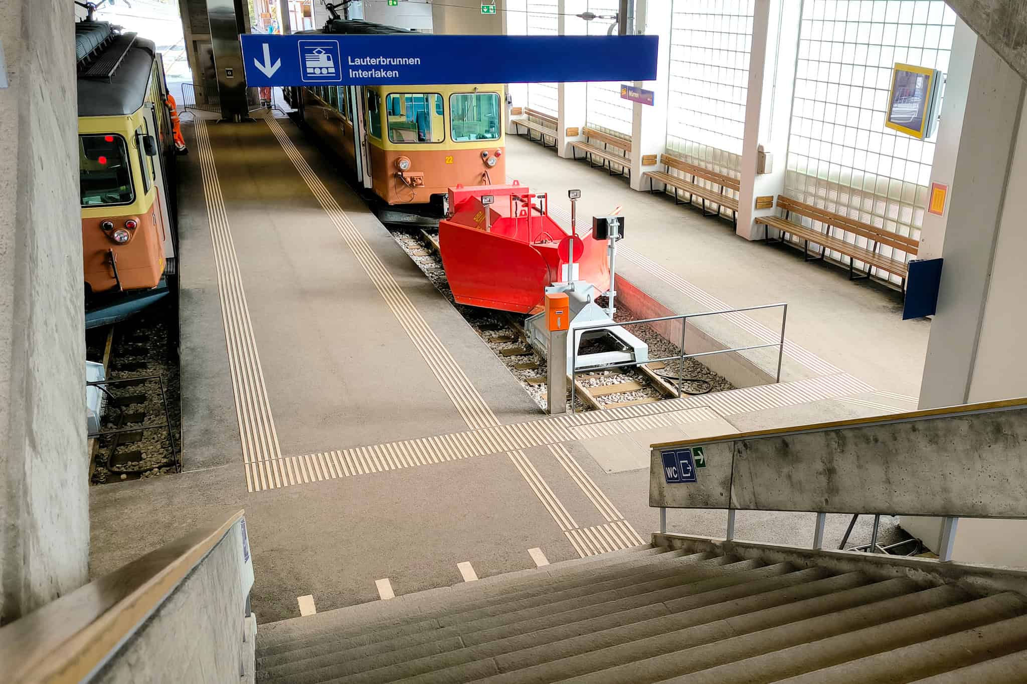 4. Steigen Sie auf der Grütschalp in den Zug Richtung Mürren. Er fährt von demselben Gebäude ab, in dem auch die Seilbahn ankommt.