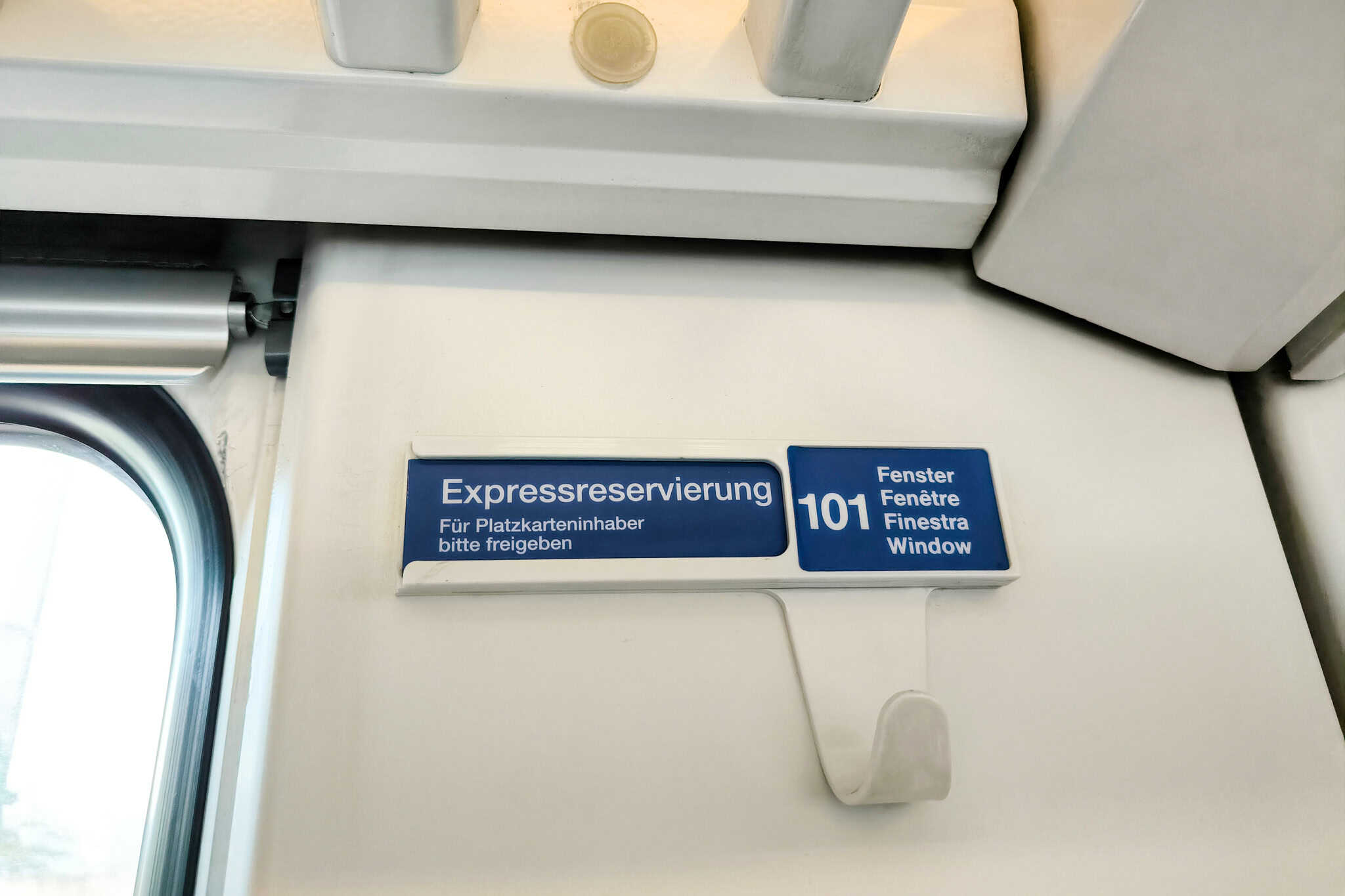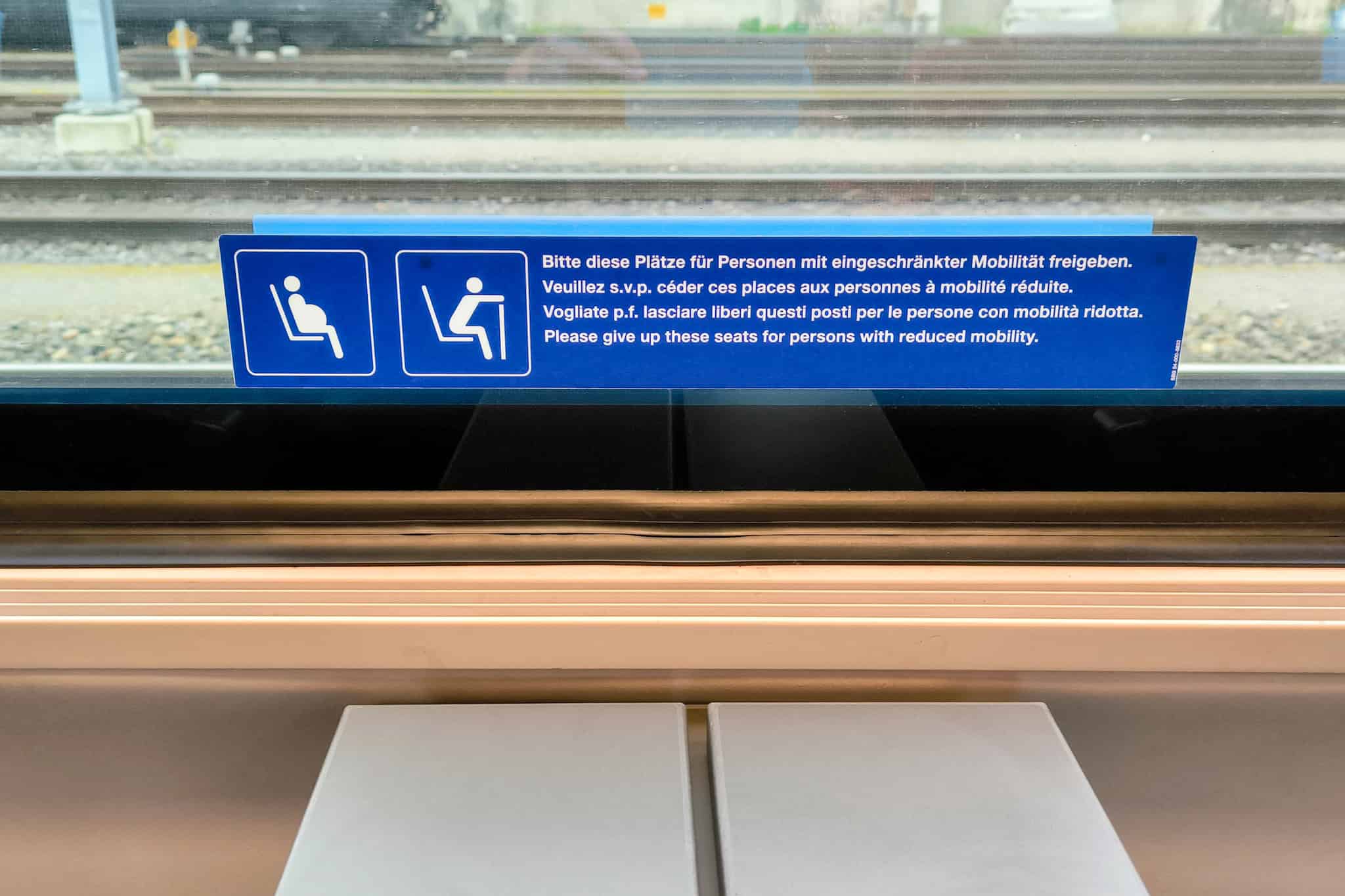 Sitzplatzreservierungen sind in der Schweiz ungewöhnlich. Sie können also sitzen, wo immer Sie wollen, solange der Platz nicht reserviert ist. Wenn dies der Fall ist, wird es durch eine kleine Anzeige über dem Sitz oder ein Schild am Sitz selbst angezeigt. Aber das werden Sie nicht oft antreffen – außer bei bestimmten internationalen Zügen oder Panoramazügen.