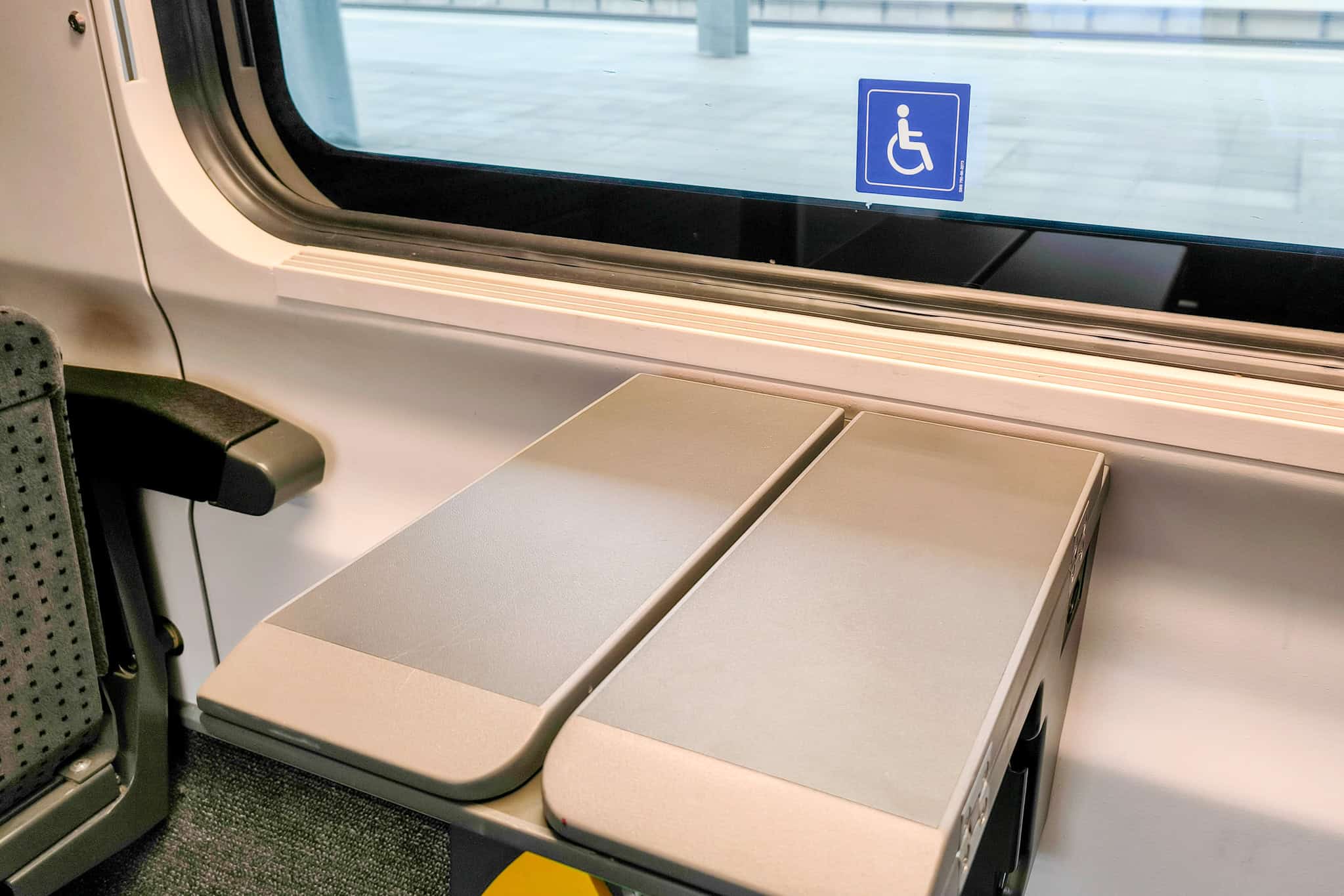 Einige Sitze oder Bereiche sind für Reisende mit eingeschränkter Mobilität vorgesehen. Dies wird durch Piktogramme und Texte angezeigt. Halten Sie diese Plätze frei. Wenn Sie dennoch dort sitzen, machen Sie Platz, wenn Fahrgäste mit eingeschränkter Mobilität den Waggon betreten.