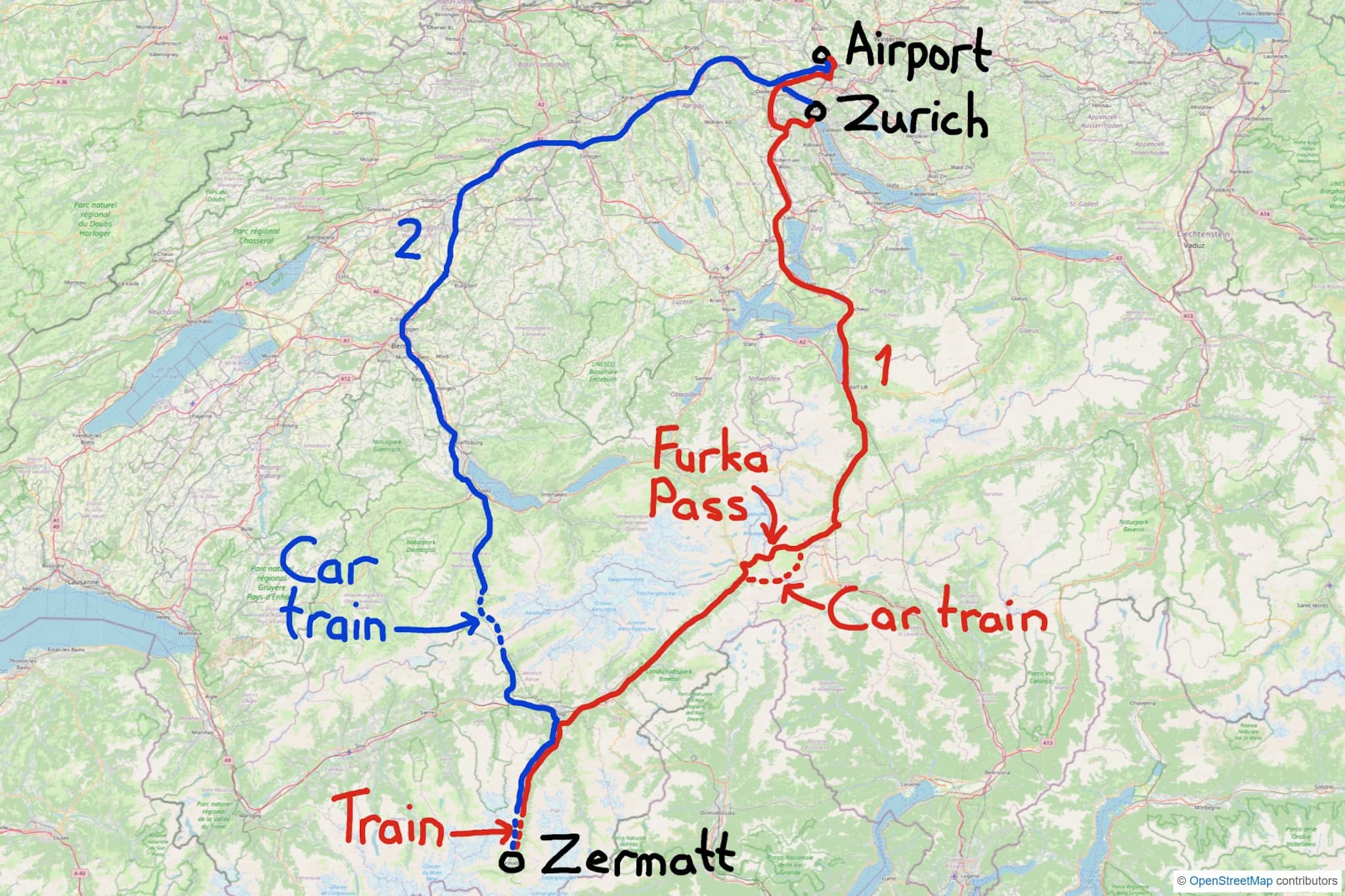 Route maps Zurich to Zermatt