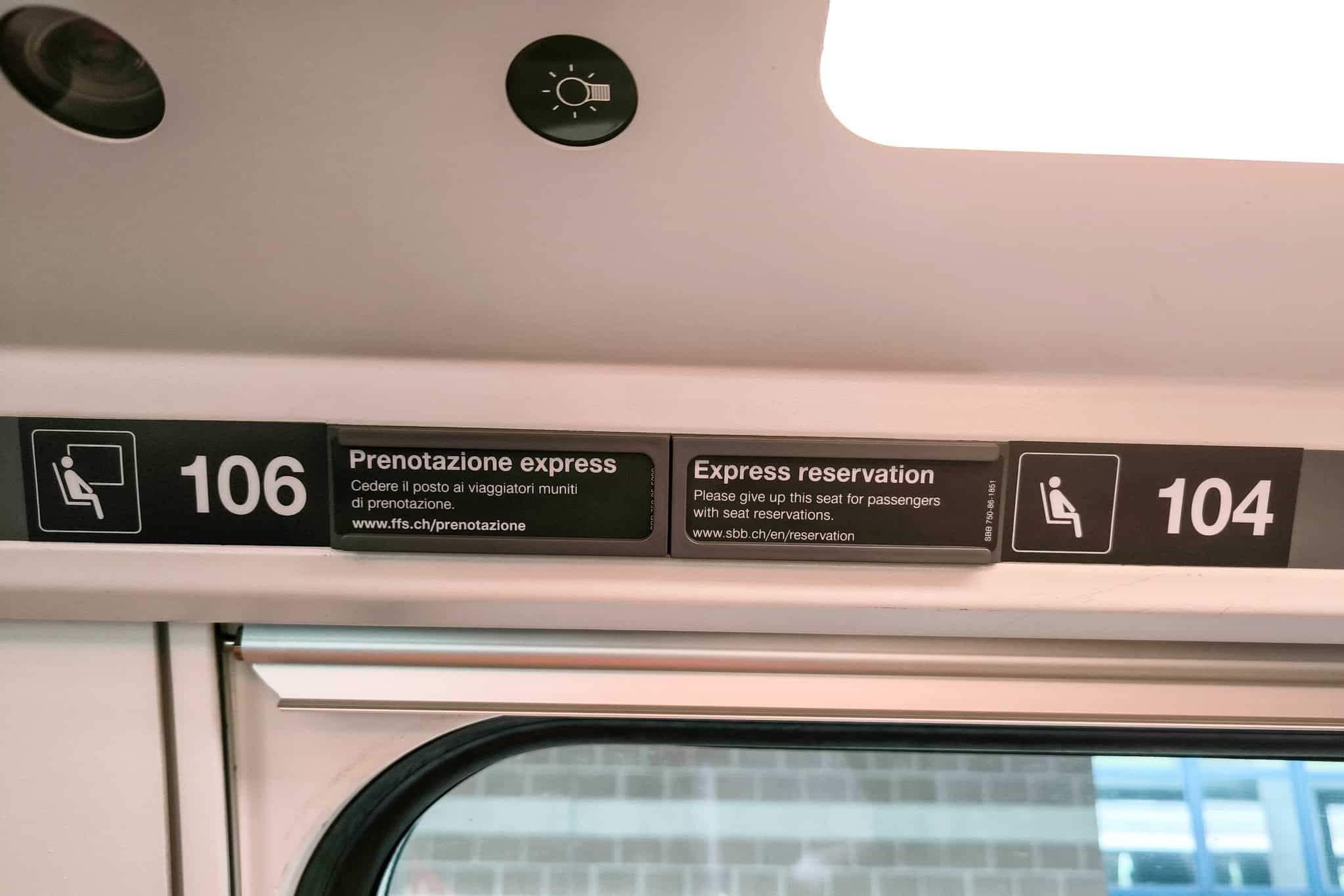 - above the seats, next to the seat numbers. A reservation is either indicated by a paper label or a digital display. In some cases, the stations between which the reservation applies are mentioned too.